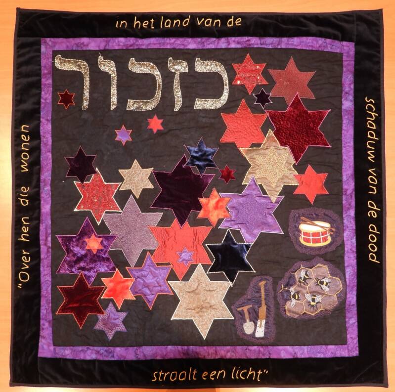 Onze quilt die we gebruiken bij onthullingen van de struikelstenen is, in 2019, voor ons gemaakt door Esther Smit - Denneboom. Zij heeft hem de titel Jizkor Gimel gegeven. De betekenis hiervan en de betekenis van de symbolen legt ze hieronder in eigen woorden uit: